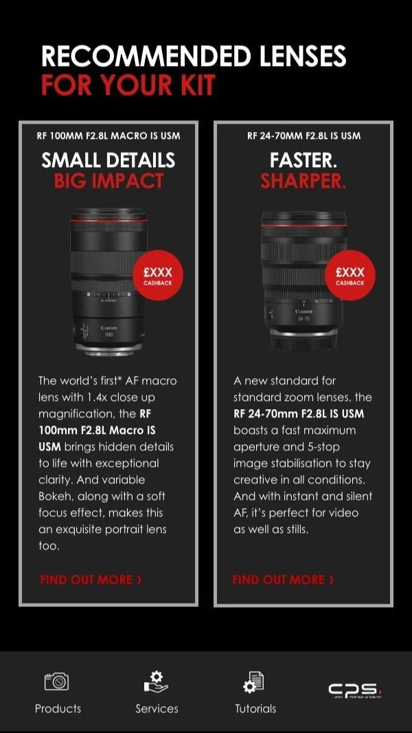 Like an offer for a new battery if your camera dies a little too often. Or a guide to the best new lenses, specially selected for your kit.